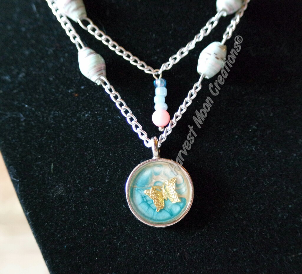 Handmade from paperbeads, paint, and glass beads! One of a kind piece with an 18 inch chain.